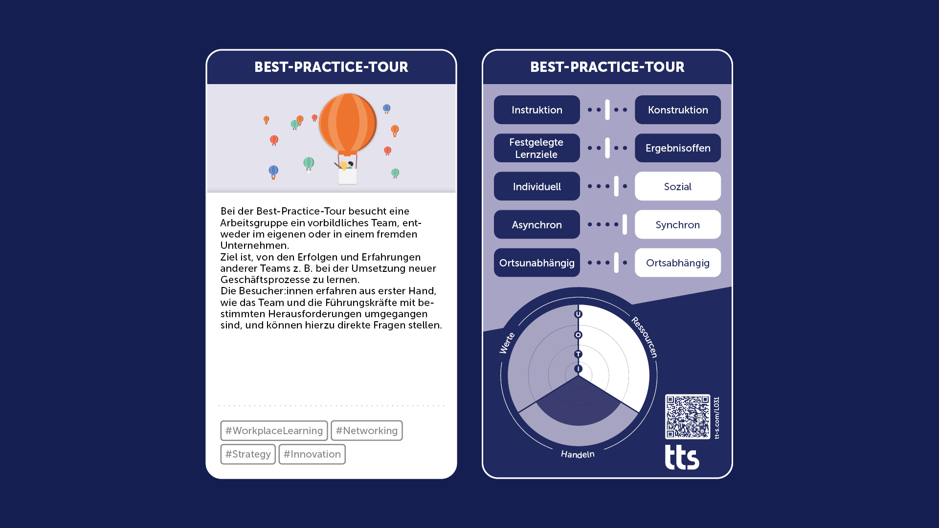 Ziel ist, von den Erfolgen und Erfahrungen anderer Teams z. B. bei der Umsetzung neuer Geschäftsprozesse zu lernen. Die Besucher:innen erfahren aus erster Hand, wie das Team und die Führungskräfte mit bestimmten Herausforderungen umgegangen sind, und können hierzu direkte Fragen stellen.