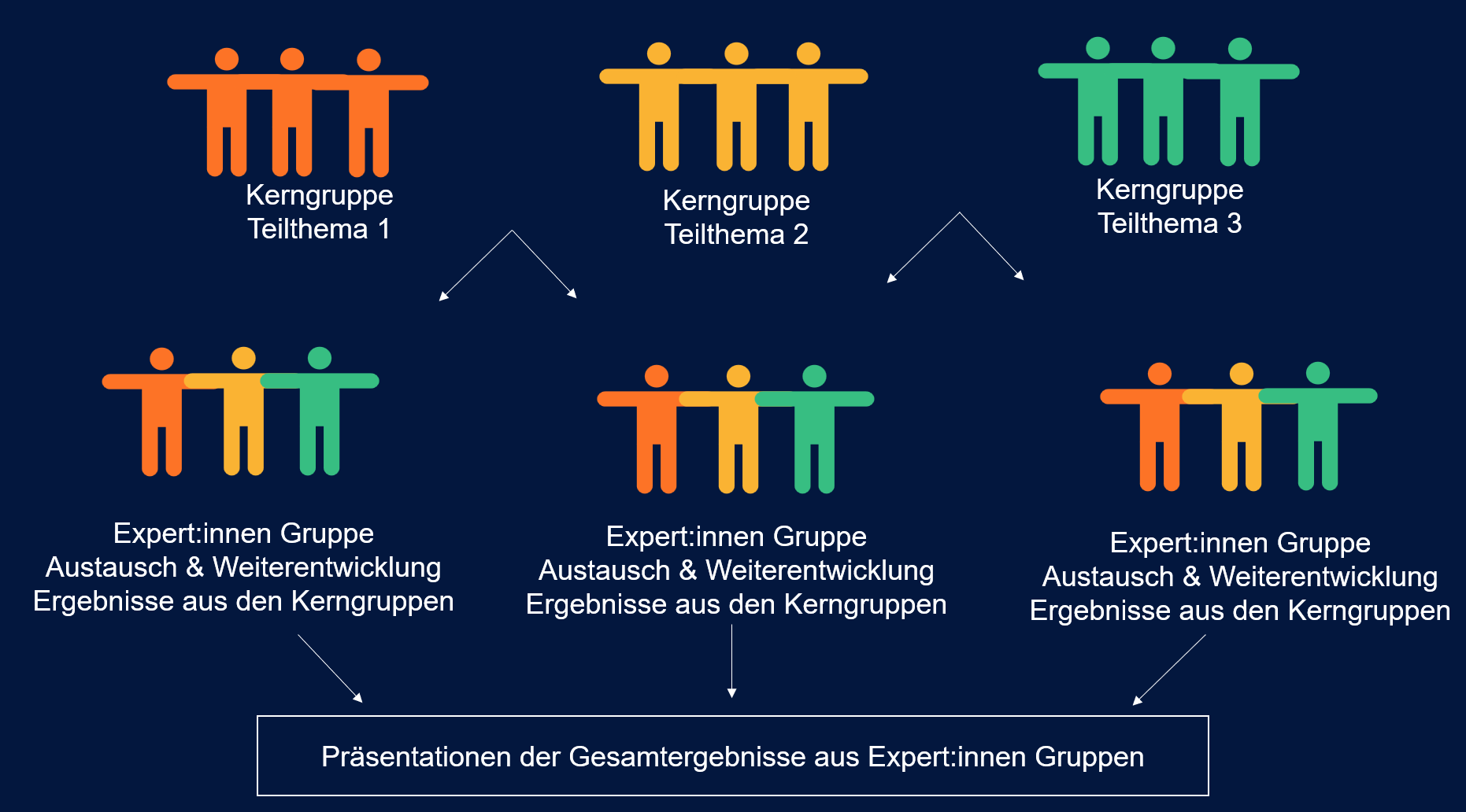 - In den Expert:innengruppen werden die in den Kerngruppen erarbeiteten Lösungen ausgetauscht und weiterentwickelt.