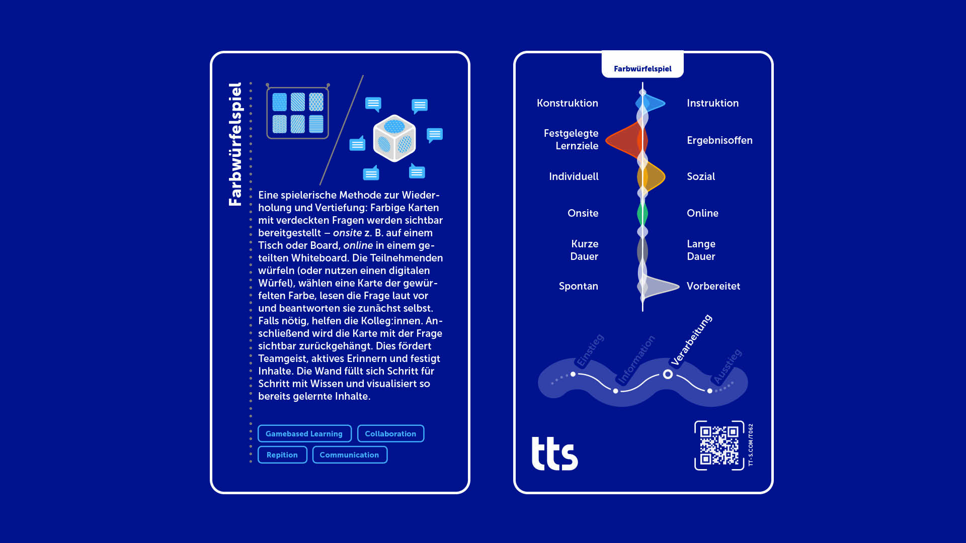 Eine spielerische Methode zur Wiederholung und Vertiefung: Farbige Karten mit verdeckten Fragen werden sichtbar bereitgestellt – onsite z. B. auf einem Tisch oder Board, online in einem geteilten Whiteboard. Die Teilnehmenden würfeln (oder nutzen einen digitalen Würfel), wählen eine Karte der gewürfelten Farbe, lesen die Frage laut vor und beantworten sie zunächst selbst. Falls nötig, helfen die Kolleg:innen. Anschließend wird die Karte mit der Frage sichtbar zurückgehängt. Dies fördert Teamgeist, aktives Erinnern und festigt Inhalte. Die Wand füllt sich Schritt für Schritt mit Wissen und visualisiert so bereits gelernte Inhalte.