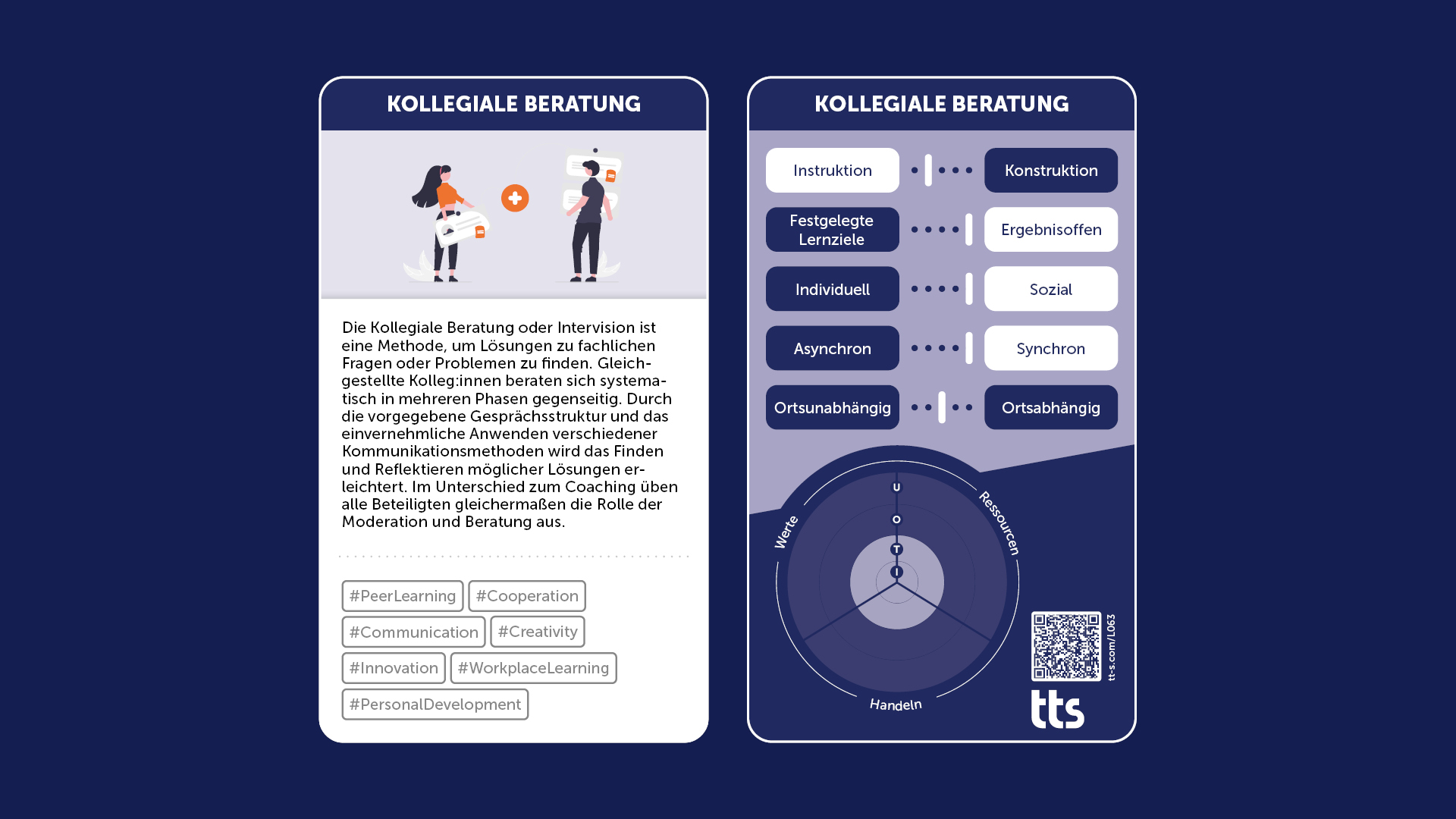 Gleichgestellte Kolleg:innen beraten sich systematisch in mehreren Phasen gegenseitig. Durch die vorgegebene Gesprächsstruktur und das einvernehmliche Anwenden verschiedener Kommunikationsmethoden wird das Finden und Reflektieren möglicher Lösungen erleichtert. Im Unterschied zum Coaching üben alle Beteiligten gleichermaßen die Rolle der Moderation und Beratung aus.