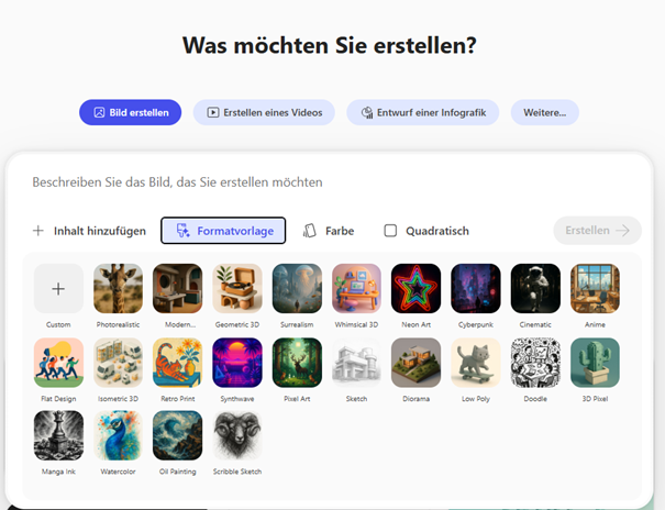 Sie können verschiedene Vorlagen nutzen, um Ihre Ergebnisse zu präzisieren. Bei der Bilderstellung können Sie beispielsweise Farb-, Stil- oder Formatvorlagen nutzen, um das Ergebnis gezielt zu verfeinern.