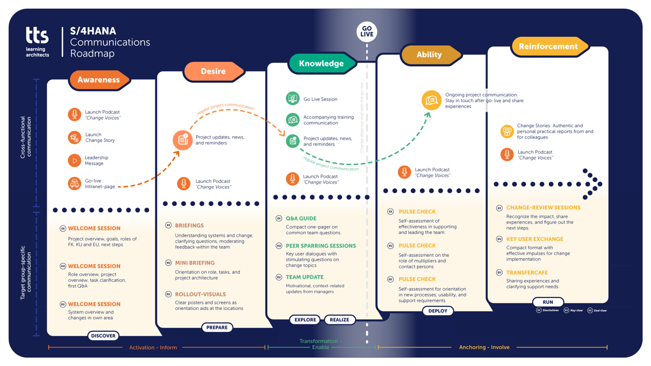 Over the past few years, we have developed a practical S/4 Change Communication Starter Kit that is deliberately based on the ADKAR phases, but in a way that can be pragmatically implemented in real projects.