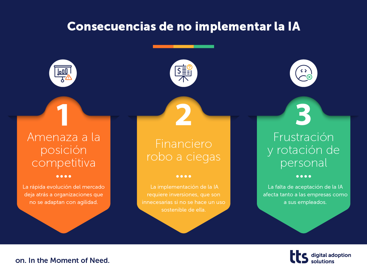 Entonces, ¿qué sucede cuando una empresa introduce la IA, pero no capacita a los empleados para trabajar con ella? Las consecuencias son graves. Porque la falta de adopción de la IA no solo pone en peligro proyectos individuales. Debilita la competitividad, frena la innovación y genera costes evitables a largo plazo.
