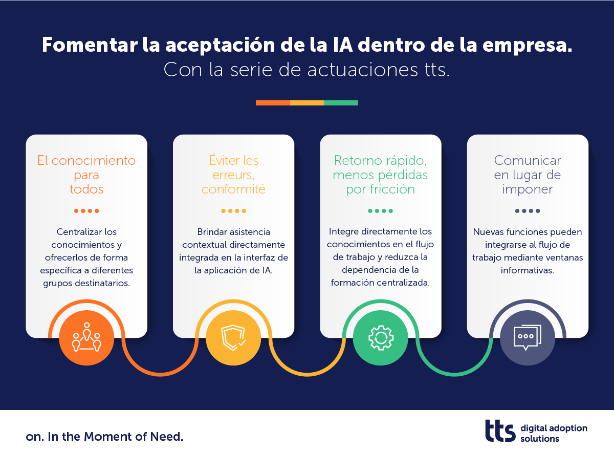 Para que la tecnología de IA se implante con éxito, no basta con proporcionar funciones. La orientación, la seguridad y la idoneidad para el uso diario son fundamentales. Aquí es donde entra en juego tts performance suite. Como plataforma de adopción digital, ayuda a los empleados directamente en el proceso de trabajo, exactamente donde están activos.