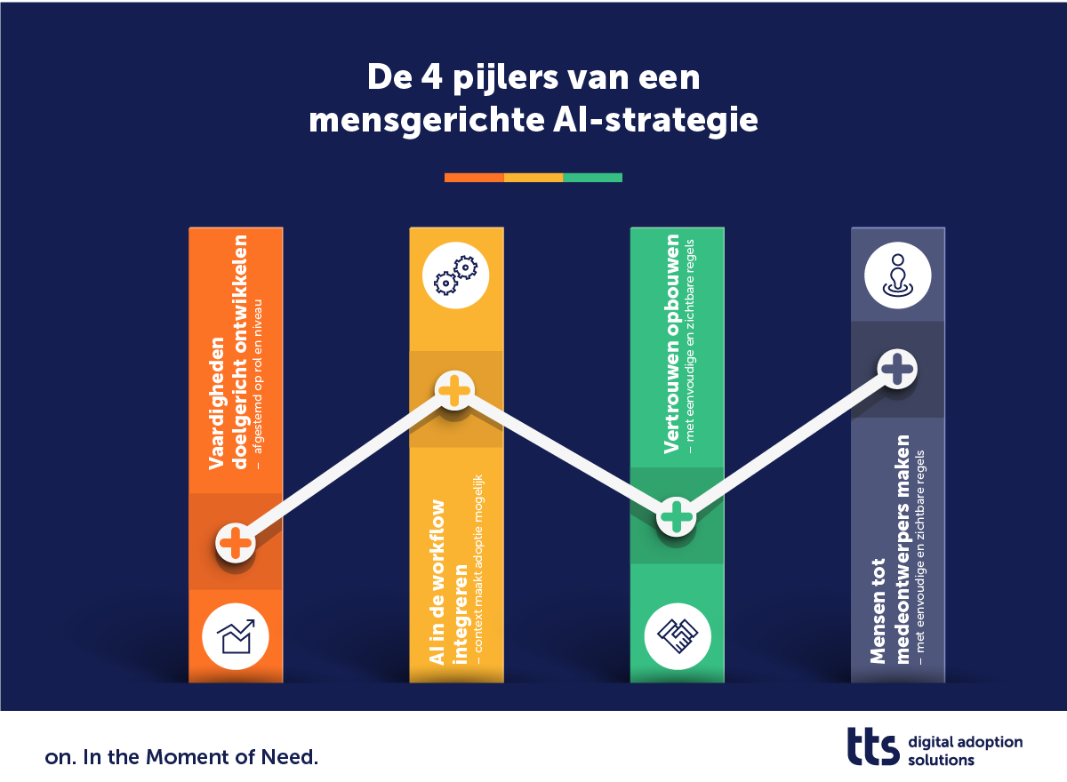 Misschien vraag je je af hoe je zo’n aanpak concreet implementeert. Het antwoord ligt in vier pijlers die de stap van pilotprojecten naar echte waardecreatie mogelijk maken, met de mens consequent centraal.